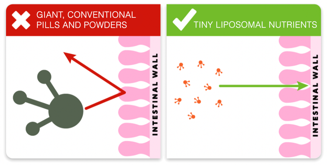 ISSUE #2: They are made of giant nutrients – meaning they are encapsulated in such a form that is too big to squeeze past your small intestine wall, hindering absorption.
